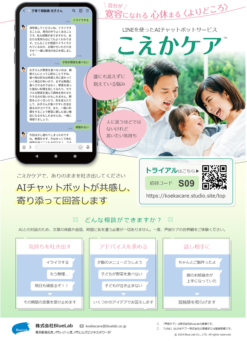 子育てにおける日々の悩みやアドバイスについて、気軽に話し相手になってもらえる生成AIチャットボットサービスです。